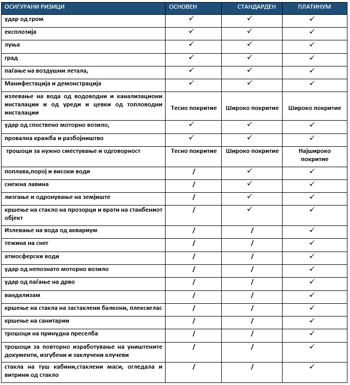 Предмети на осигурување со полисата за осигурување се градежниот објект-стан/куќа, предмети на домаќинско- покуќнината, хартии од вредност,готовина, ументнички предмети, скапоцености, лични исправи, документи како и можност за осигурување на сончеви колектори и сателитски антени.